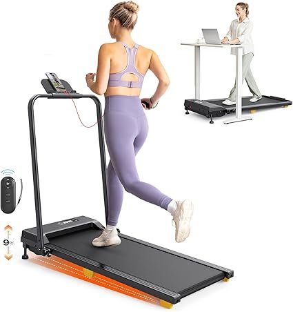 • 2-in-1 Versatility: Switch seamlessly between modes to match your routine. Under-desk walking: Slow-paced (0.6–4 mph) (1-6 km/h) for staying active while working. Full treadmill mode: Raise the handle for speeds up to 6.2 mph (10km/h), catering to beginners and experienced runners alike.